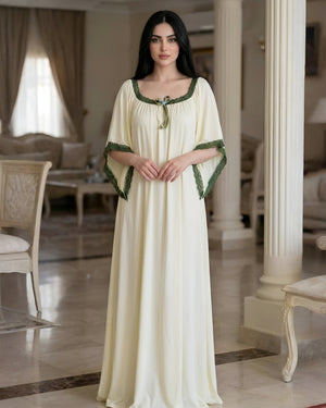 • الخامة: رويال كومفورت سيلك + دانتيل قطن مطرز