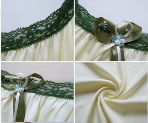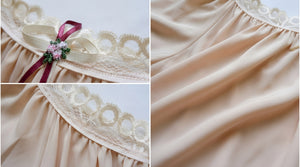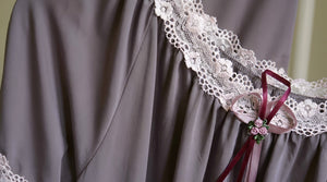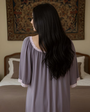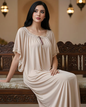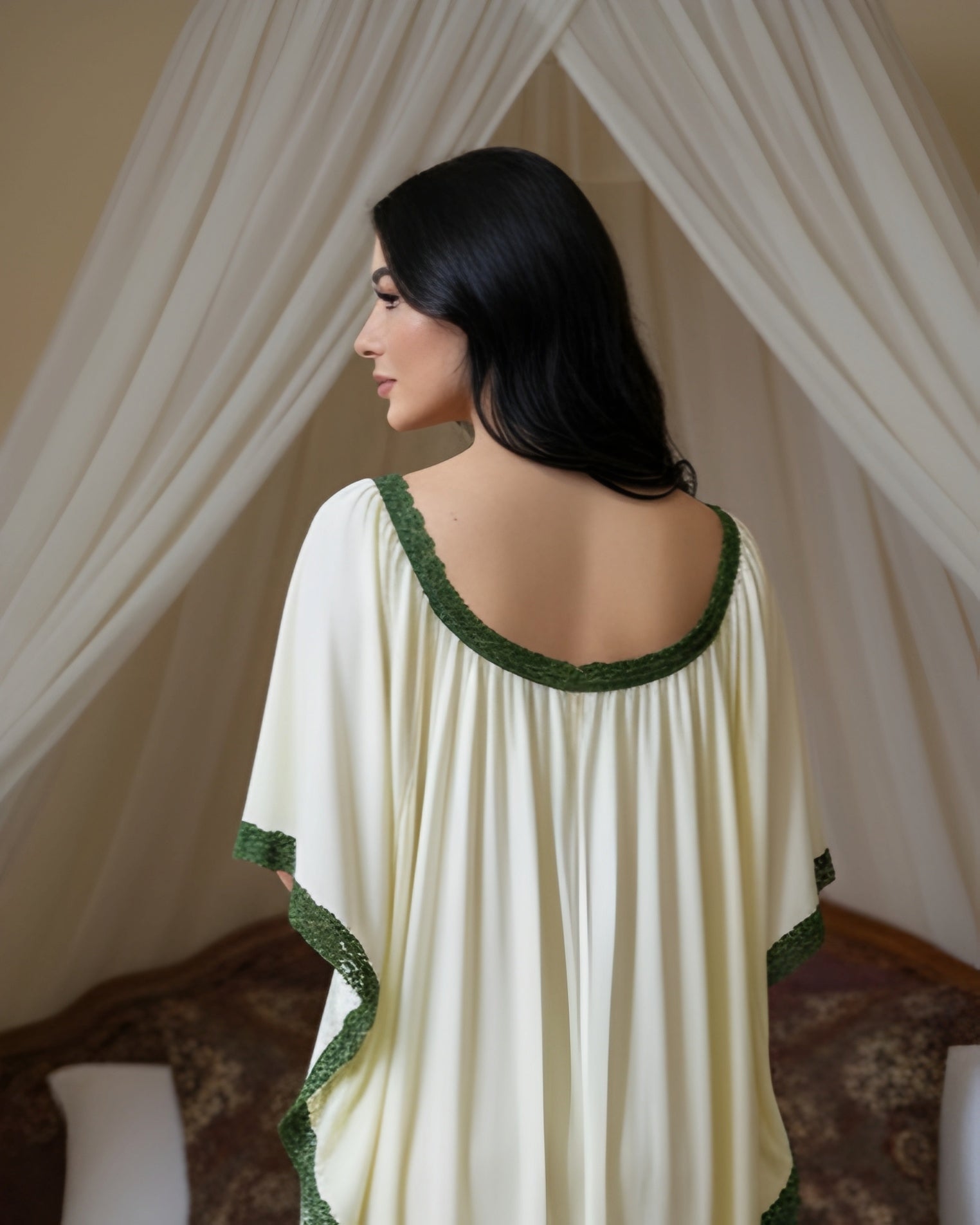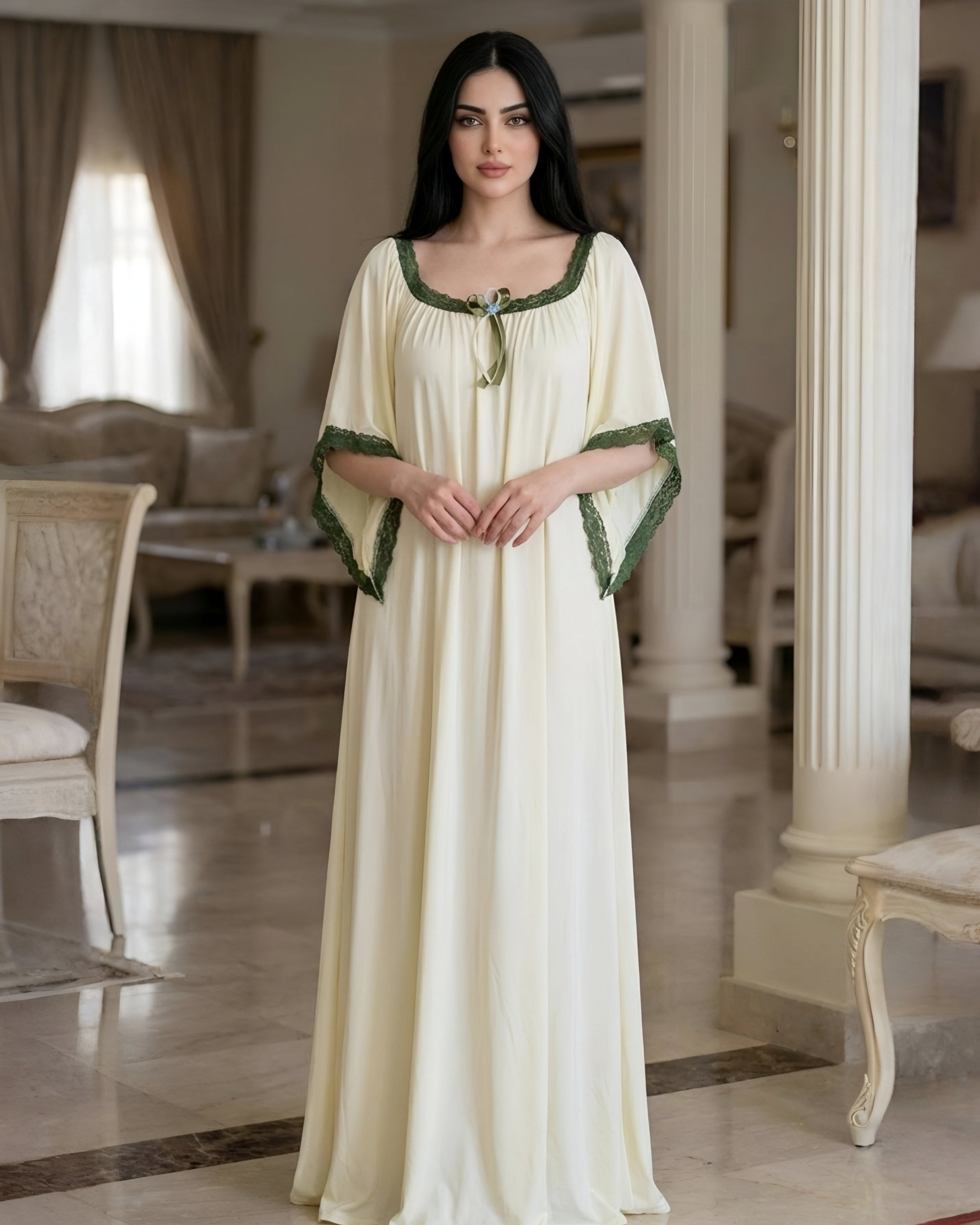 الدانتيل ناعم على الأكمام والياقة بتطريز مرتب يعطي إحساس فخم بدون إزعاج على البشرة.