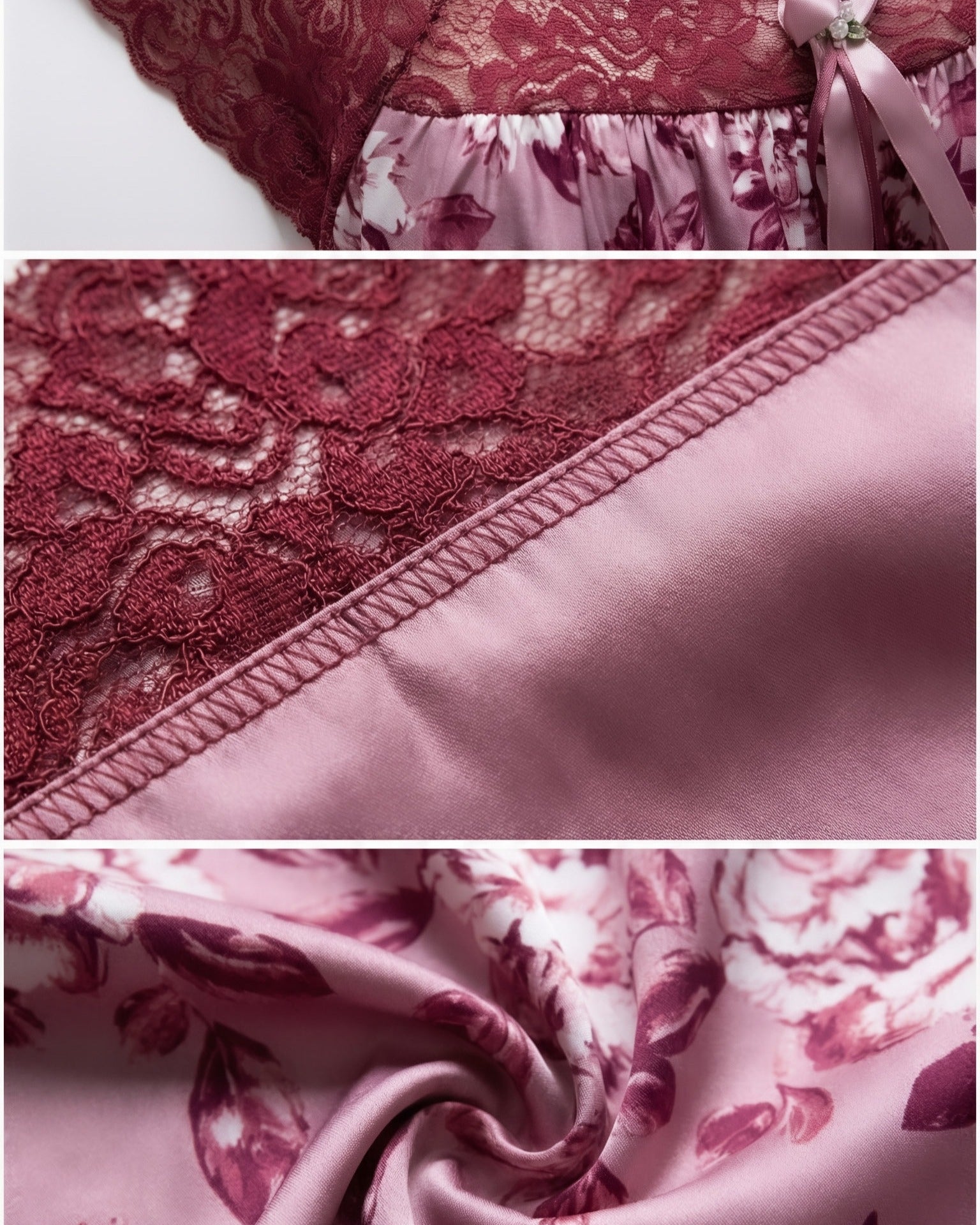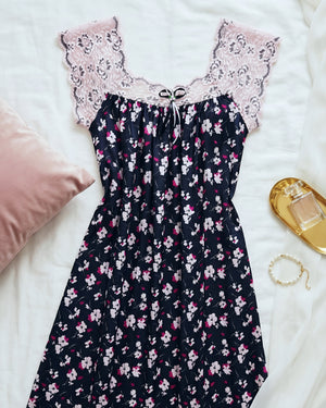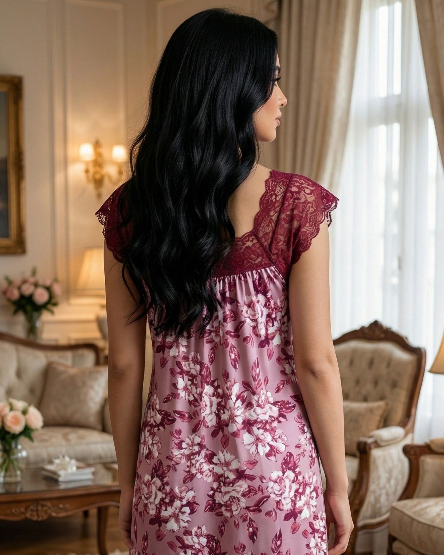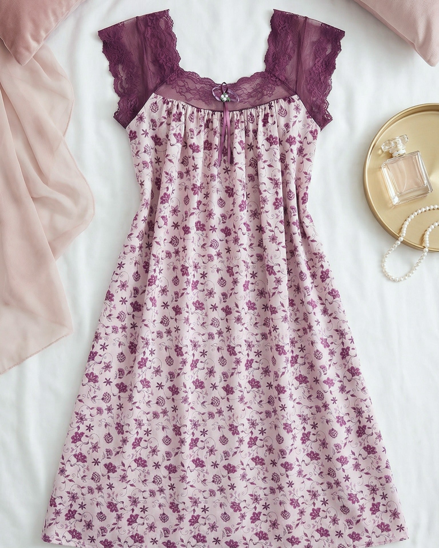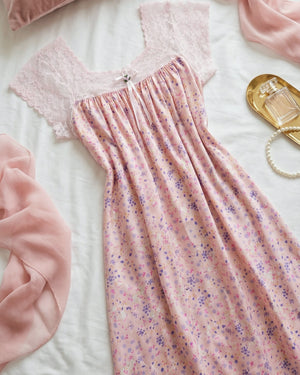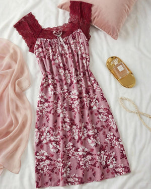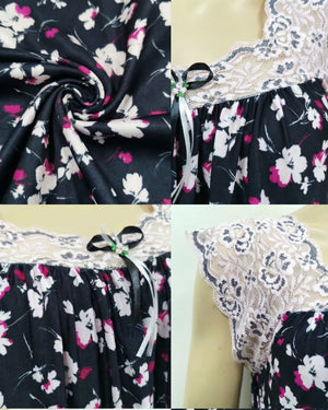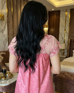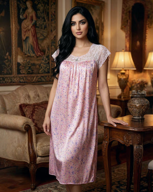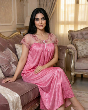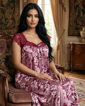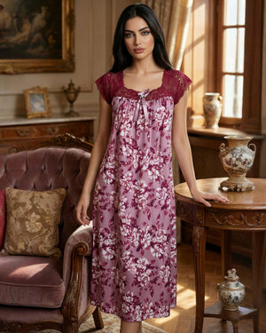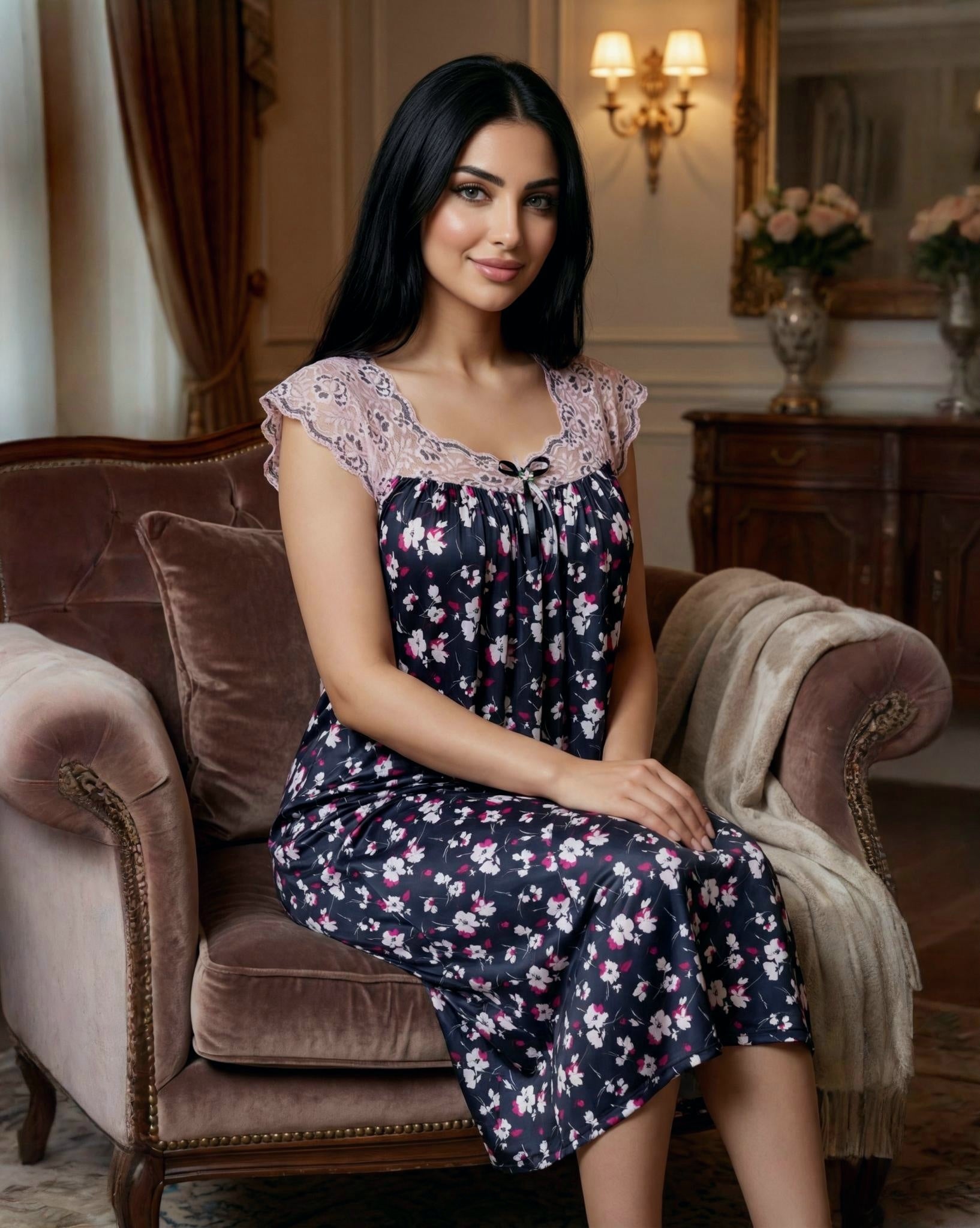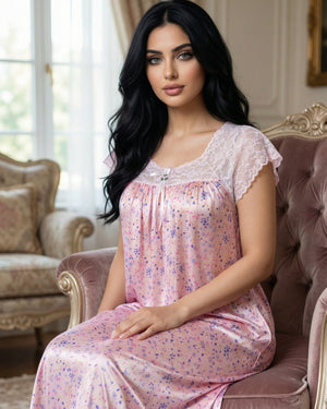 يتميّز هذا الموديل بنقشة فلوريال  أنيقة تغطي القماش بالكامل وتمنحه طابعاً أنثوياً ناعماً ومميزاً. يزين الجزء العلوي دانتيل هادئ يمتد على الصدر والكتفين ليضيف لمسة فاخرة وخفيفة، مع أكمام دانتيل قصيرة تمنح التصميم مظهراً راقياً ومتوازناً.
